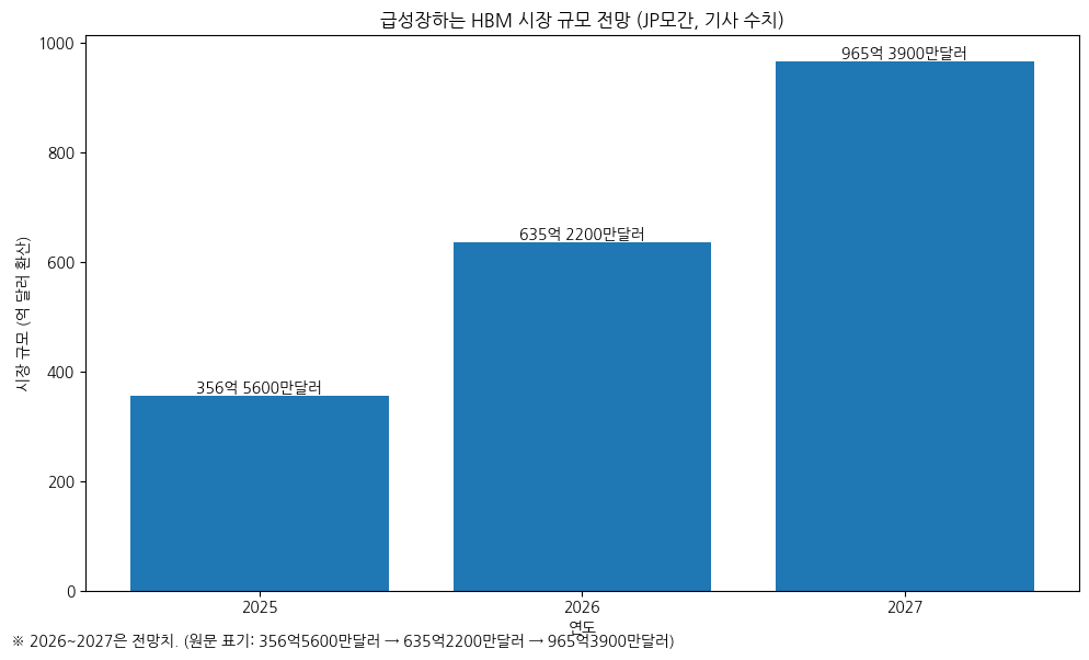 HBM 시장은 지금 “파이 자체가 커지는 국면”이에요. 기사에 나온 전망치 기준으로 HBM 시장 규모는 다음처럼 커져요.