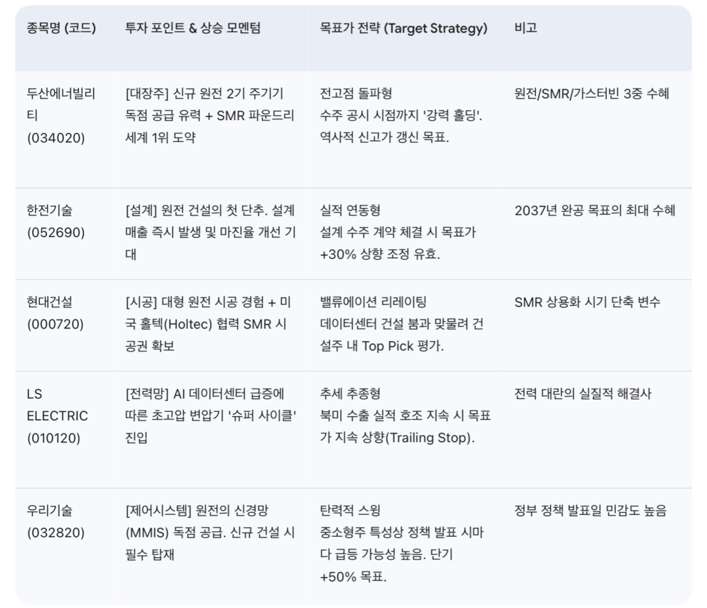 • 우리기술: 원전의 핵심 신경망인 감시제어시스템(MMIS)을 독점 공급하는 강소기업입니다. 신규 원전 건설 시 필수적으로 들어가는 부품이라 수주 확실성이 높습니다.