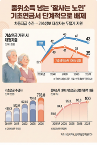 기초연금은 중위소득과는 상관없이 ‘소득 하위 70%’기준으로 월 34만원 씩 받을 수 있는 제도입니다. 돈을 벌건 …
