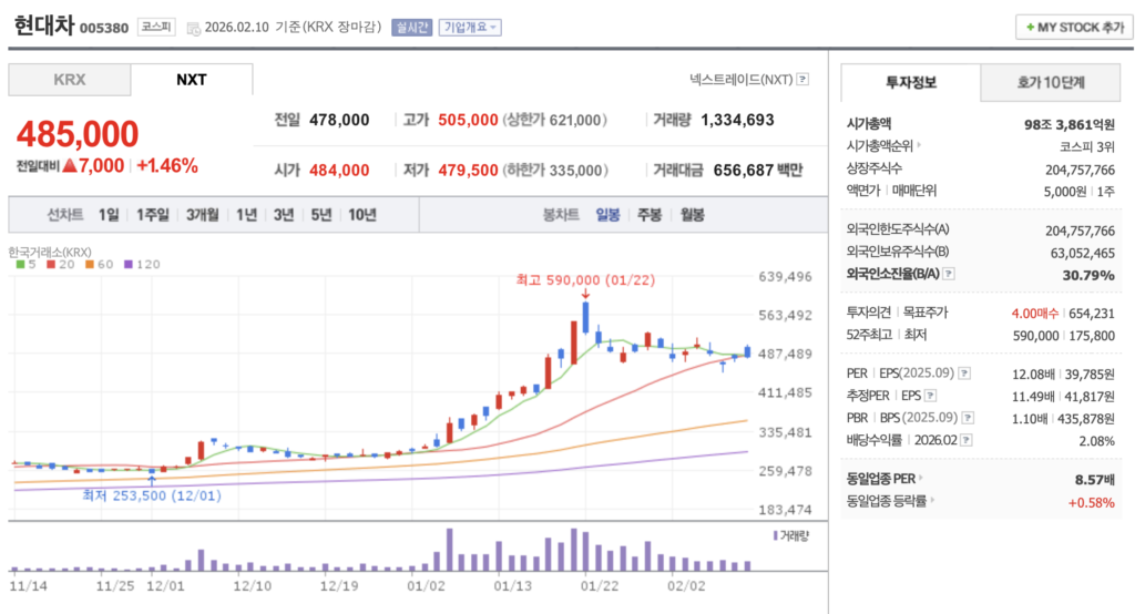 2026년 2월 10일, 현대자동차(005380)는 전일 대비 1.46% 상승한 485,000원으로 장을 마감했습니다. 장중 한때 505,000원까지 치솟으며 50만 원 고지를 터치하기도 했는데요. 단순히 완성차 판매 실적을 넘어, 이제는 ‘로봇 대장주’로서 재평가받고 있는 현대차의 투자 포인트를 차트와 함께 분석해 보겠습니다.
