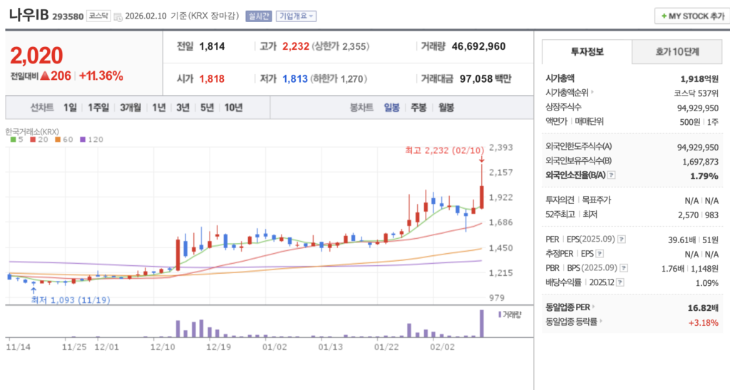- 정책 수혜의 연결고리: 정부가 공공 컴퓨팅 인프라에 국산 NPU를 전격 도입하기로 하면서, 퓨리오사AI의 기업 가치가 폭등함에 따라 지분을 보유한 나우IB로 강력한 낙수 효과가 발생하고 있습니다.